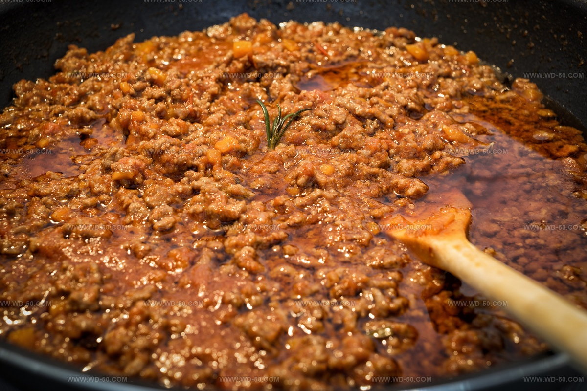 Unlike ragu alla bolognese, carnecapuliata contains fewer tomatoes and omits celery and carrots.