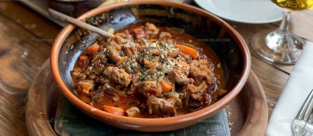 Hunters and countryside families have traditionally prepared this hearty dish using fresh rabbit meat carefully braised with aromatic vegetables and red wine.