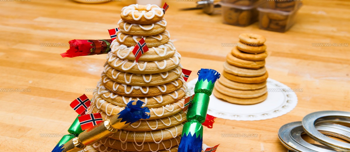 Traditional Norwegian celebrations feature this striking sweet centerpiece adorned with small flags or decorative elements.