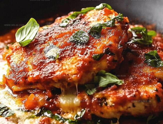 - Generously cascade marinara sauce over the chicken, allowing the vibrant red sauce to mingle with melting cheese.
