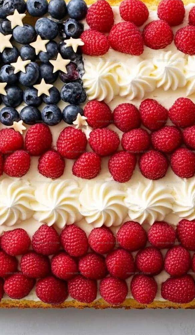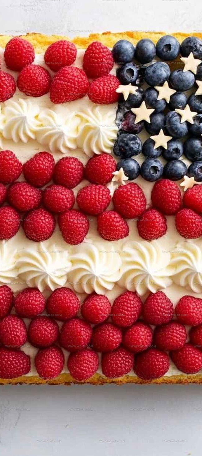 - Transform the cake into a patriotic design by spreading approximately three-quarters of the prepared icing uniformly across the cooled surface. Utilize a toothpick to delicately sketch the flag outline. Arrange blueberries to fill the top left quadrant. Methodically pipe alternating rows of raspberries and icing to create distinctive stripes. Complete the design by piping elegant star shapes using the remaining icing over the blueberry section.