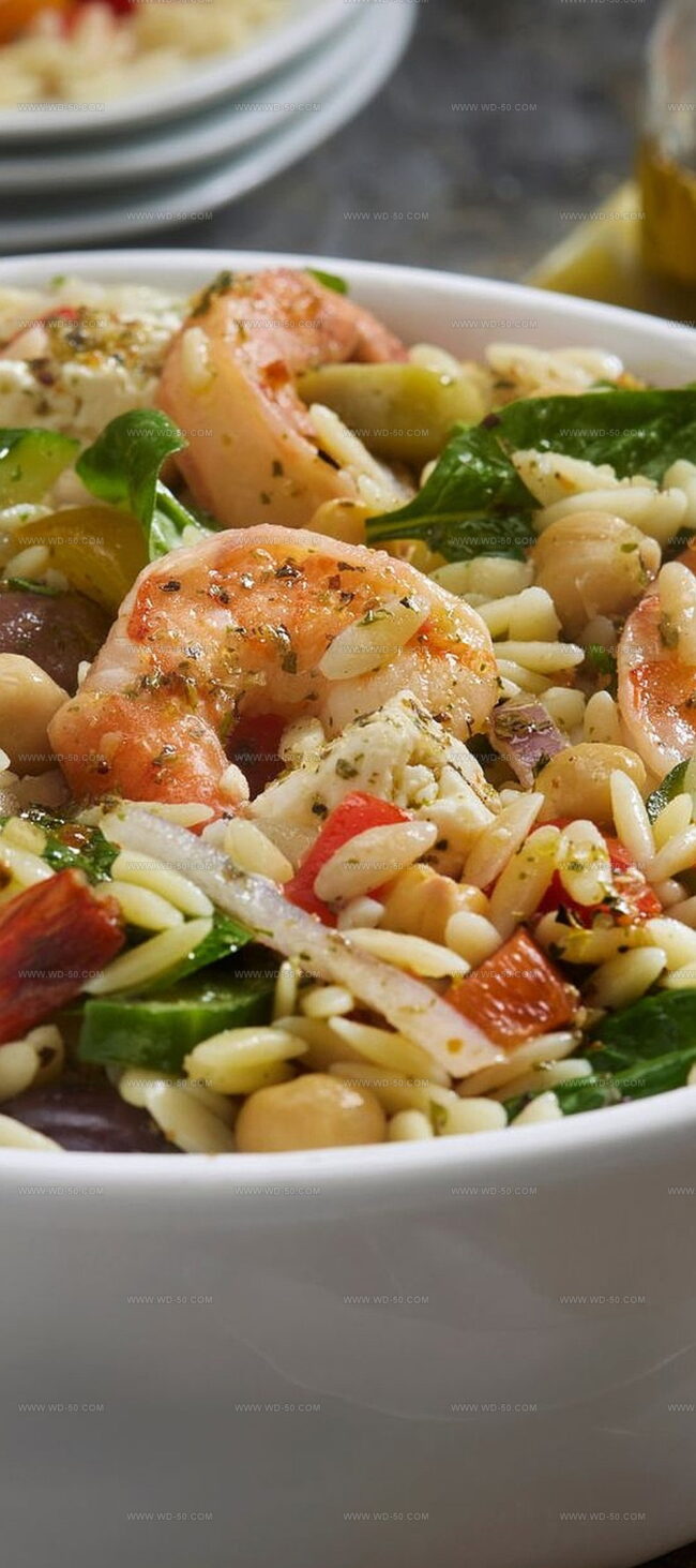 Zesty lemon and fragrant herbs dance across delicate orzo and succulent roasted shrimp, creating a symphony of taste sensations.