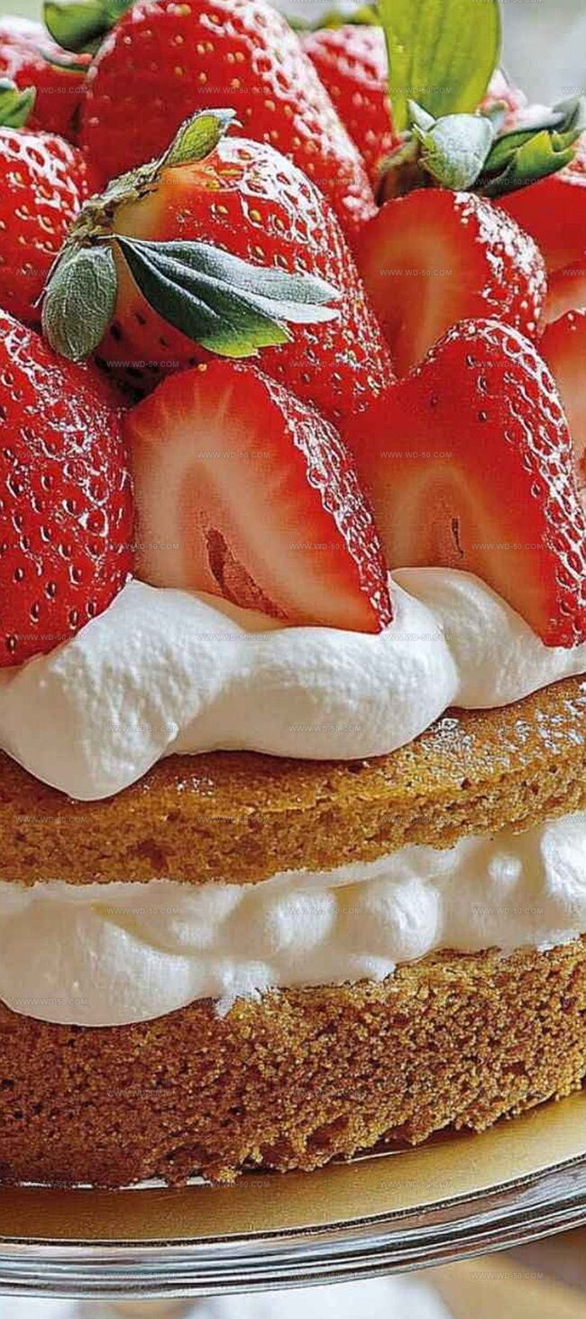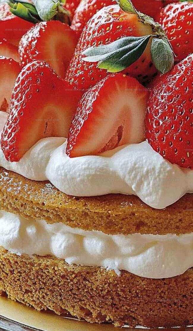 - Carefully position the top cake layer and cover with the remaining whipped cream. Garnish with additional fresh strawberries for a beautiful and appetizing presentation.