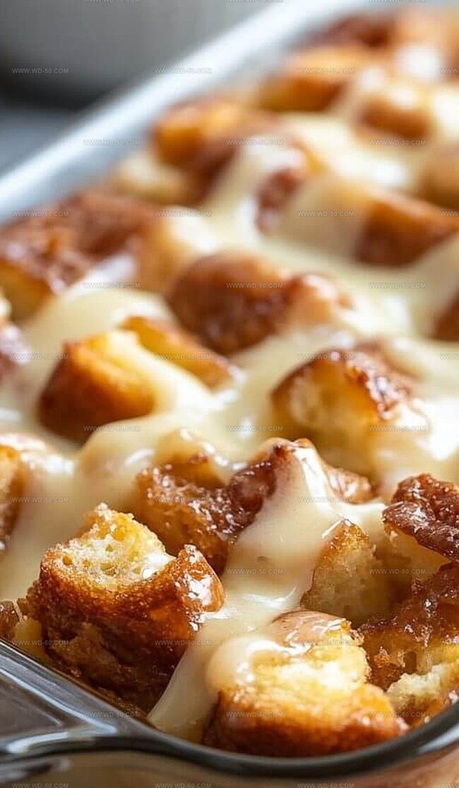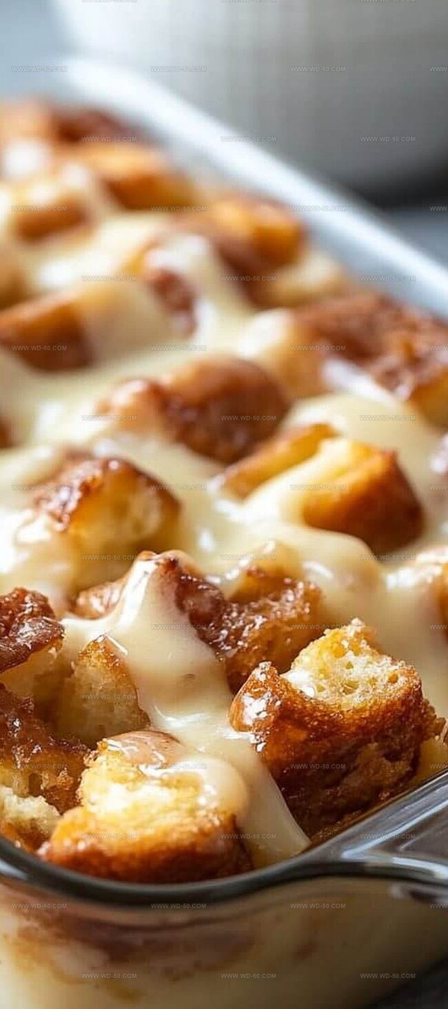 Warm, comforting memories flood back with this classic grandmas old-fashioned bread pudding with vanilla sauce that carries the rich aroma of home-cooked nostalgia.