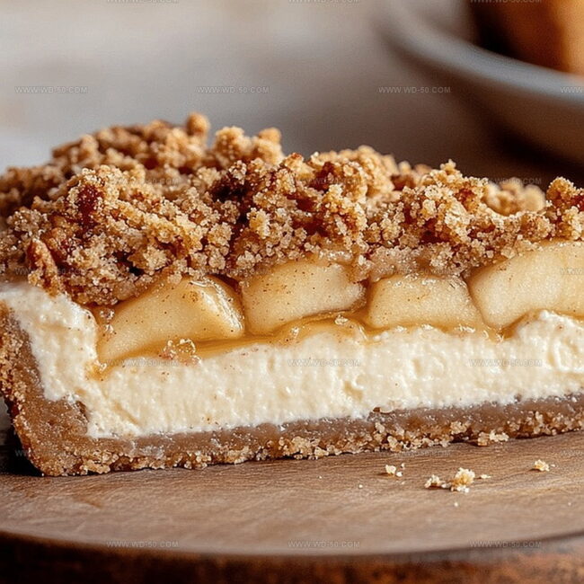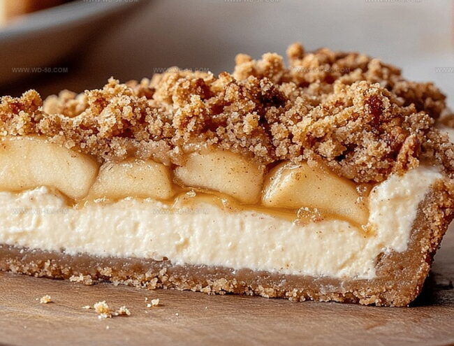 Layers of rich, velvety cheesecake blend seamlessly with warm, spiced apple crumble topping.