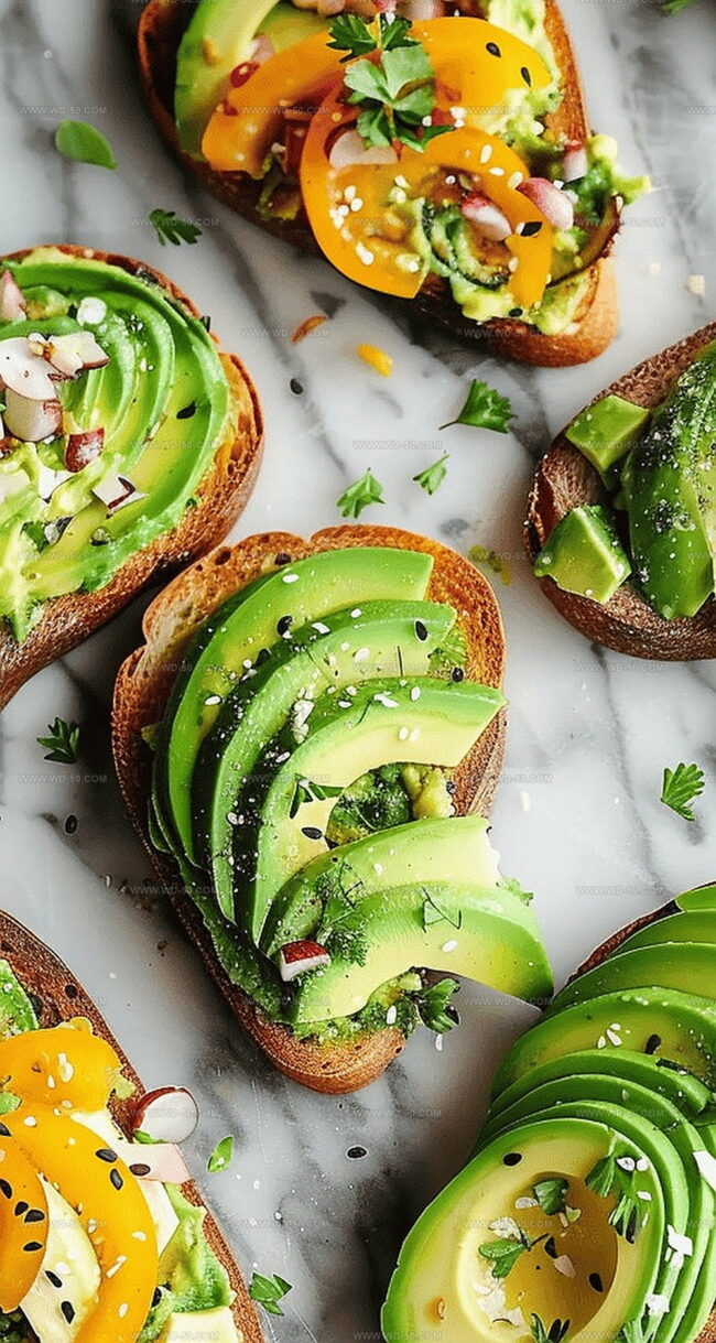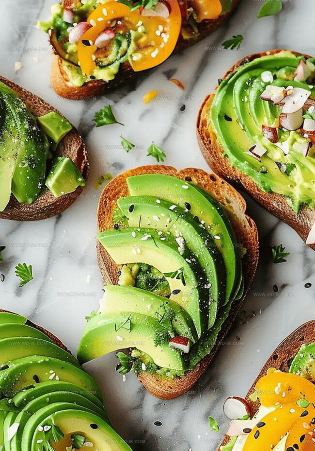 Creamy, ripe avocados dance with crisp bread, creating a perfect harmony of textures and flavors.