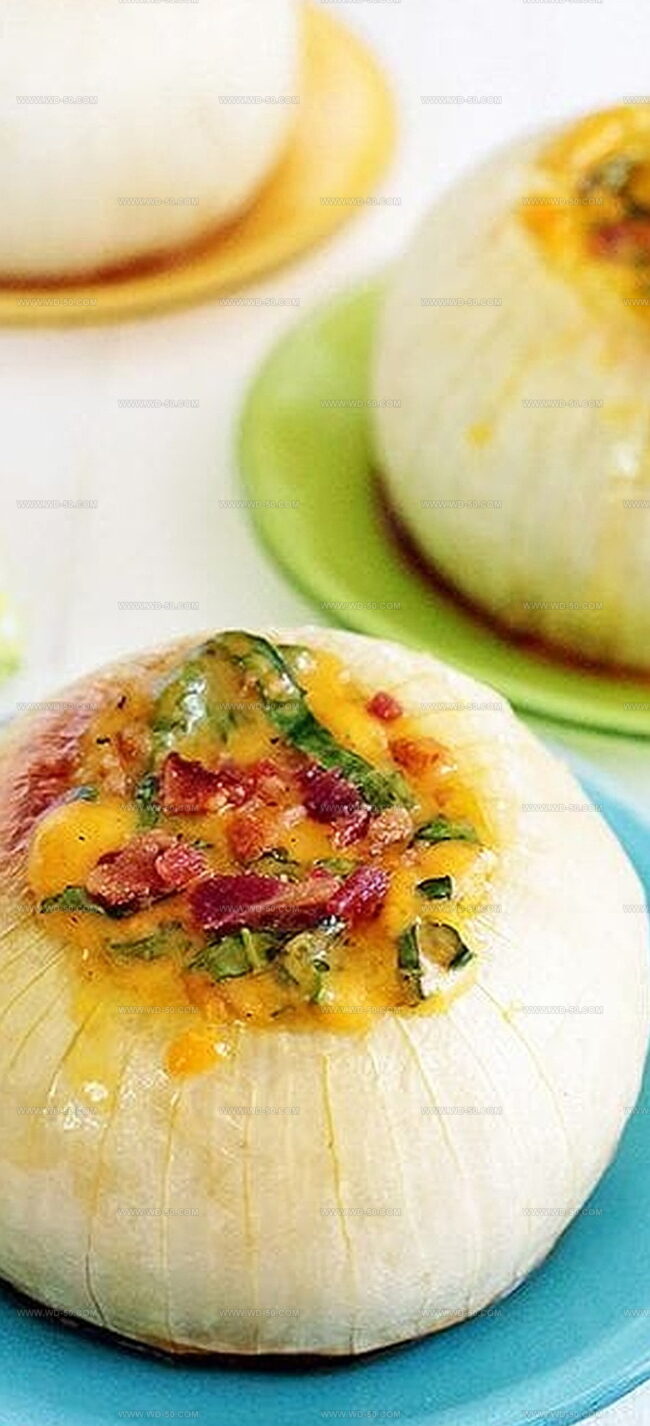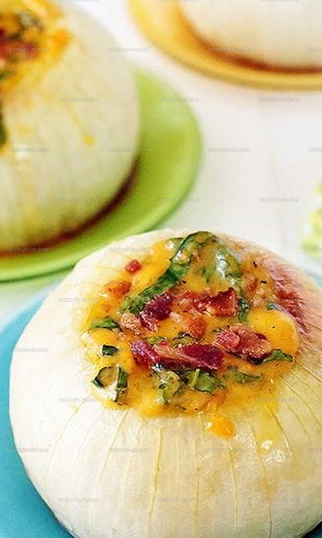 Rich, melted cheese mingles with crispy bacon bits, turning ordinary onions into an extraordinary culinary experience.