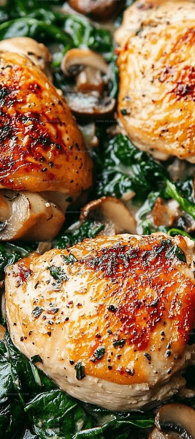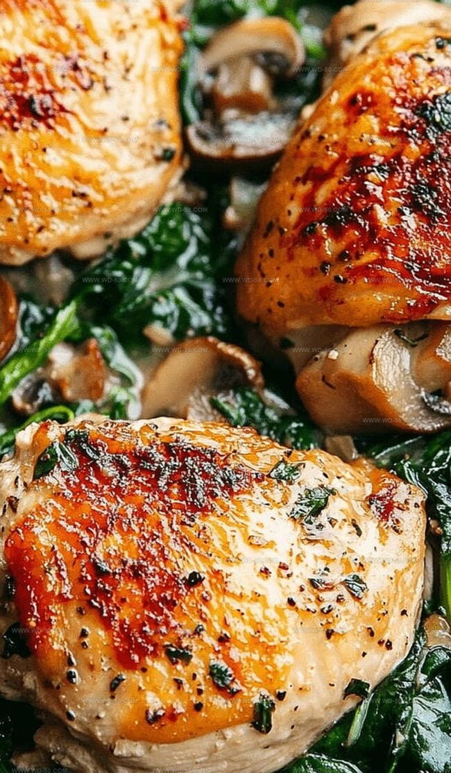Sizzling aromas fill the kitchen as this chicken, spinach, and mushroom skillet recipe promises a delightful culinary adventure.