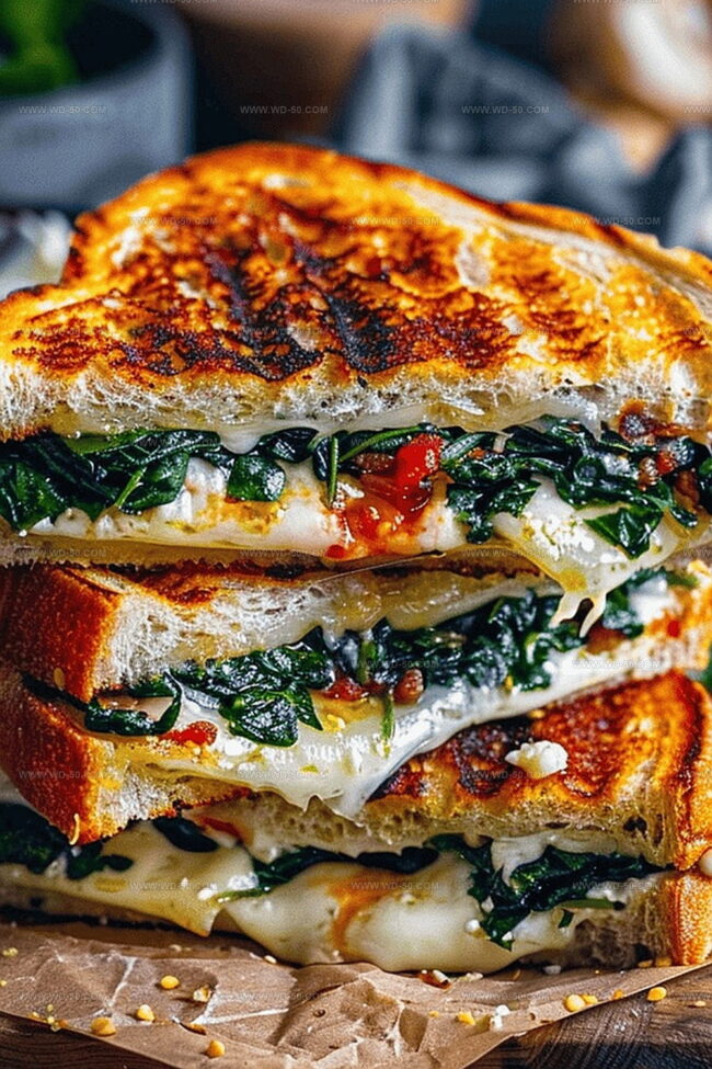 Leafy Green Magic fresh spinach dances with chili flakes, oregano, and a delicate salt sprinkle. Quick sautéing allows leaves to wilt elegantly, releasing their vibrant flavor and creating a lush green layer for the sandwich.