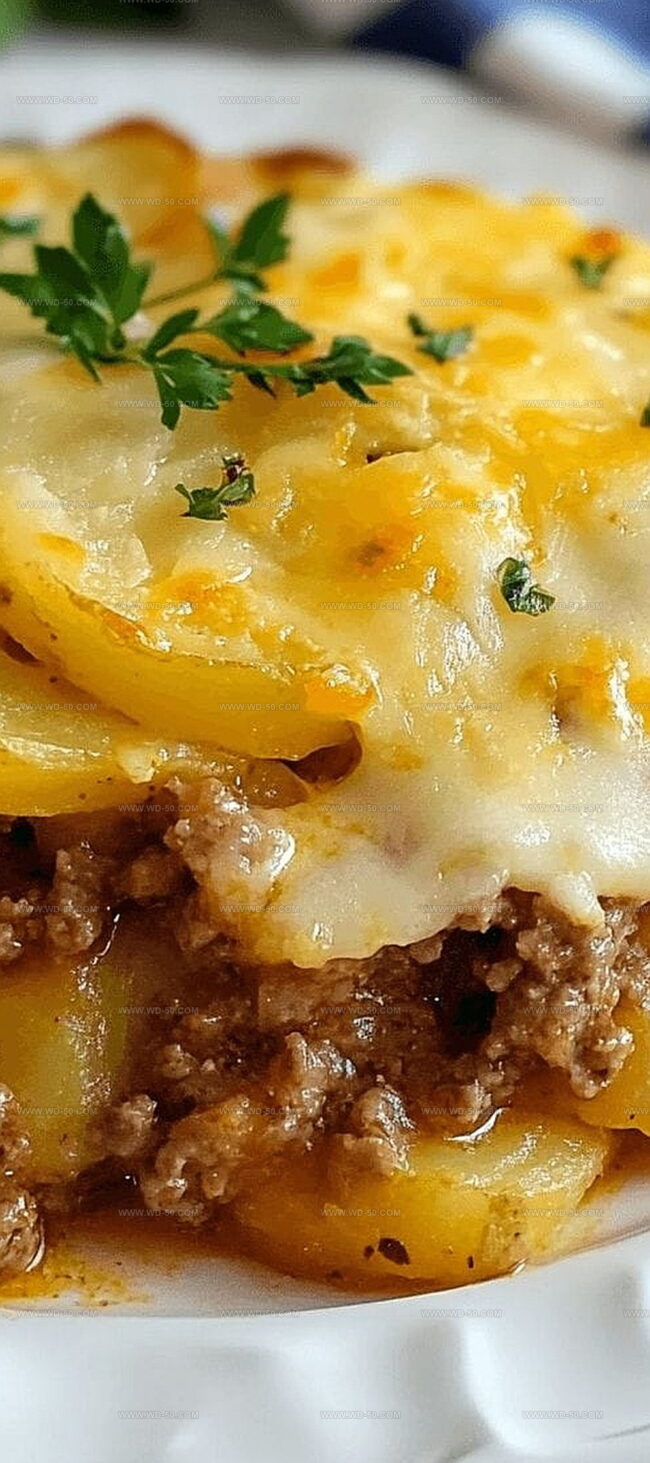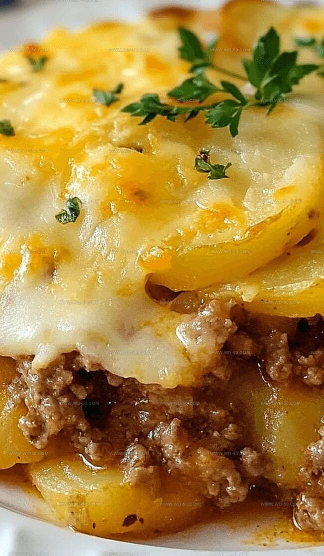Layers of tender potatoes mingle with seasoned ground beef in a creamy, melted cheese embrace.