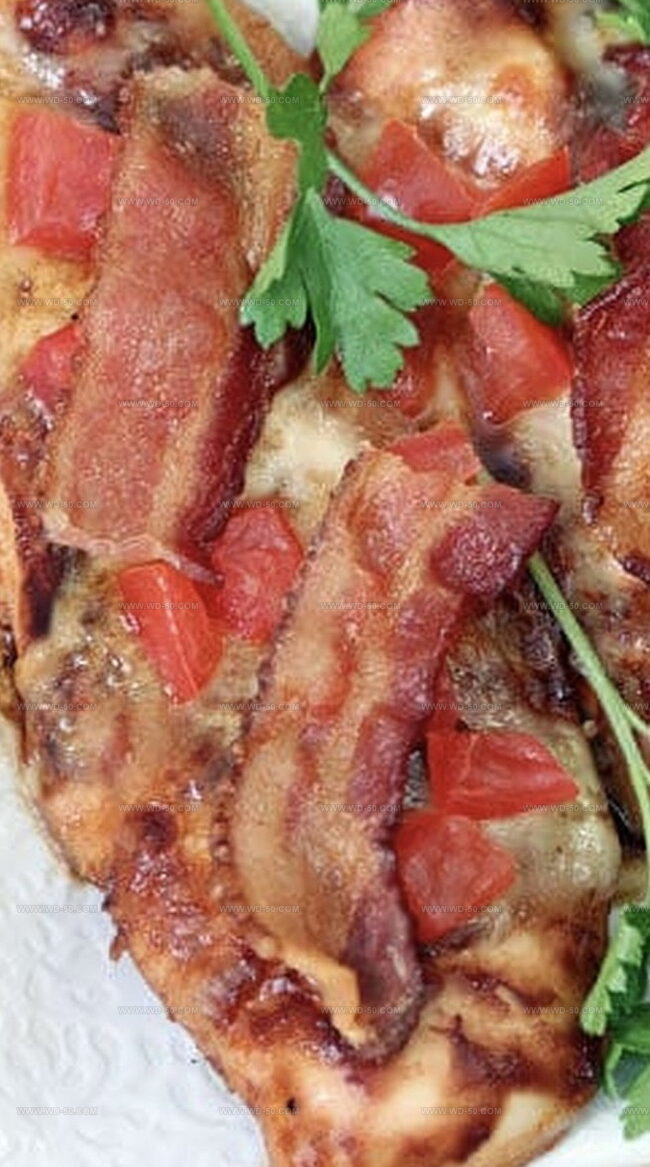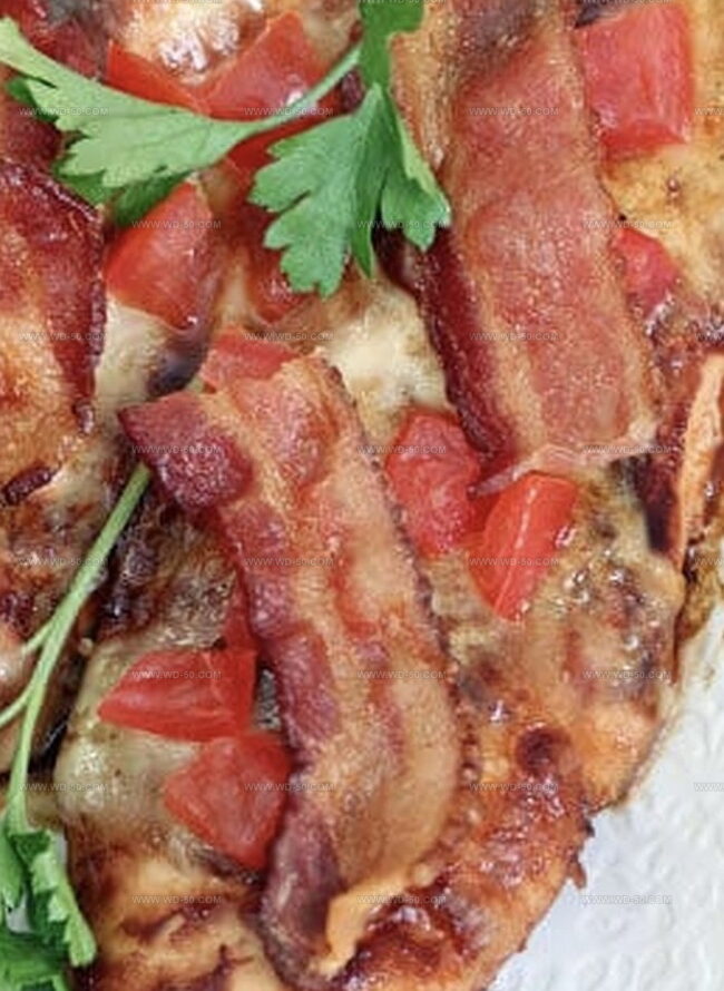 Game Day Crowd-Pleaser: Cut the chicken into bite-sized pieces and serve as a crowd-friendly appetizer with toothpicks, allowing guests to enjoy the cheesy, bacon-topped goodness during sports events or casual gatherings.