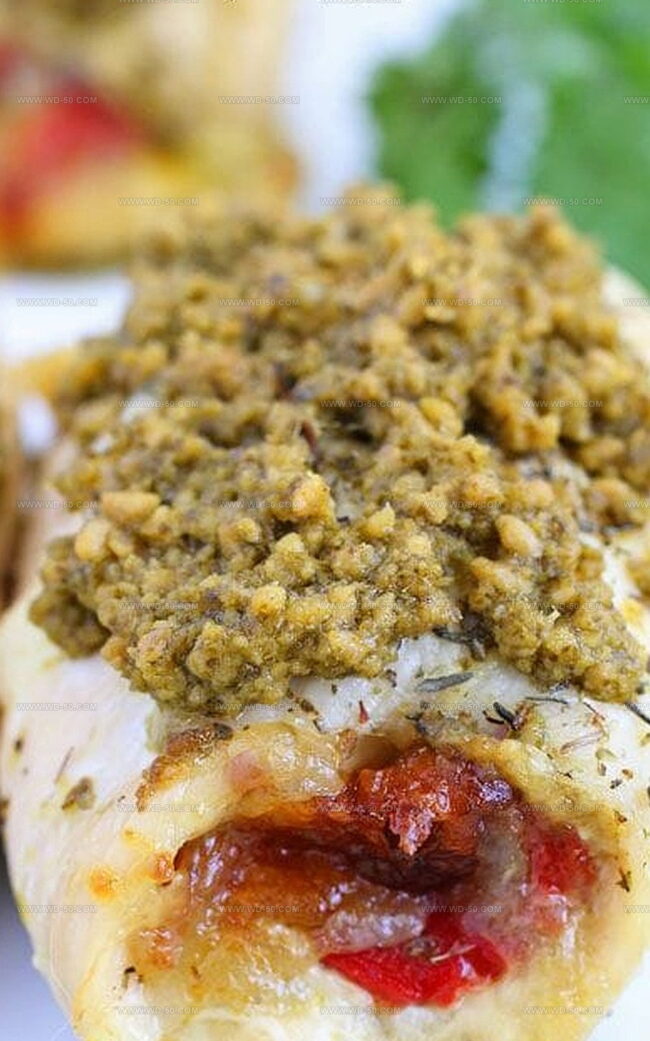 Serving Spectacle Gently remove toothpicks. Crown each roll with an artistic dollop of remaining pesto, ready to delight taste buds with Mediterranean-inspired elegance.