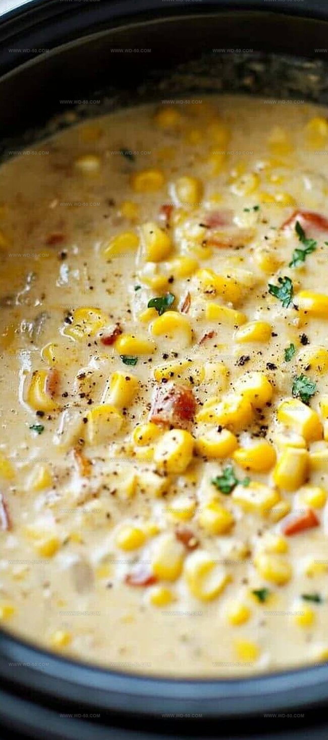 Comfort arrives in a steaming bowl of hearty slow cooker corn chowder that promises warmth and satisfaction.