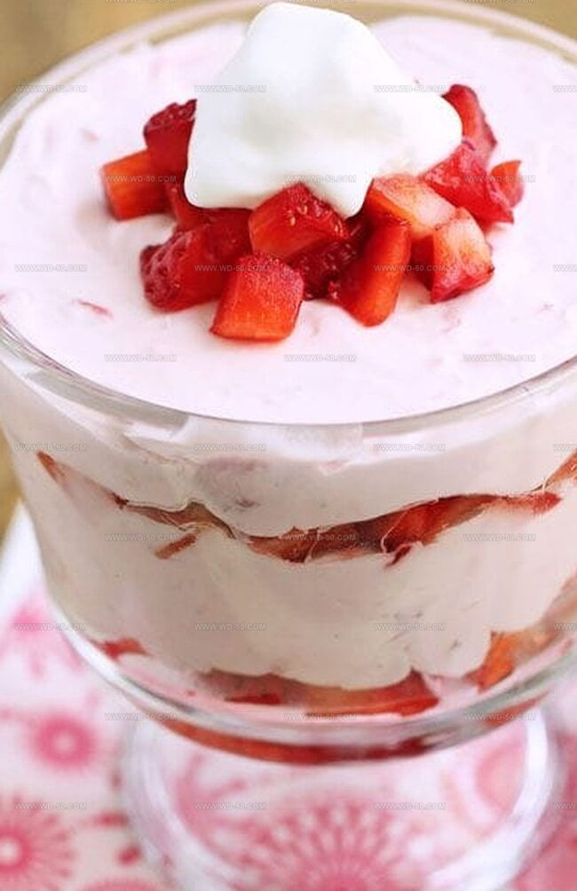 Final Composition: Expertly layer the strawberry mousse over the fruit base, interspersing additional strawberry fragments and topping with a decorative swirl of remaining whipped cream for visual appeal.