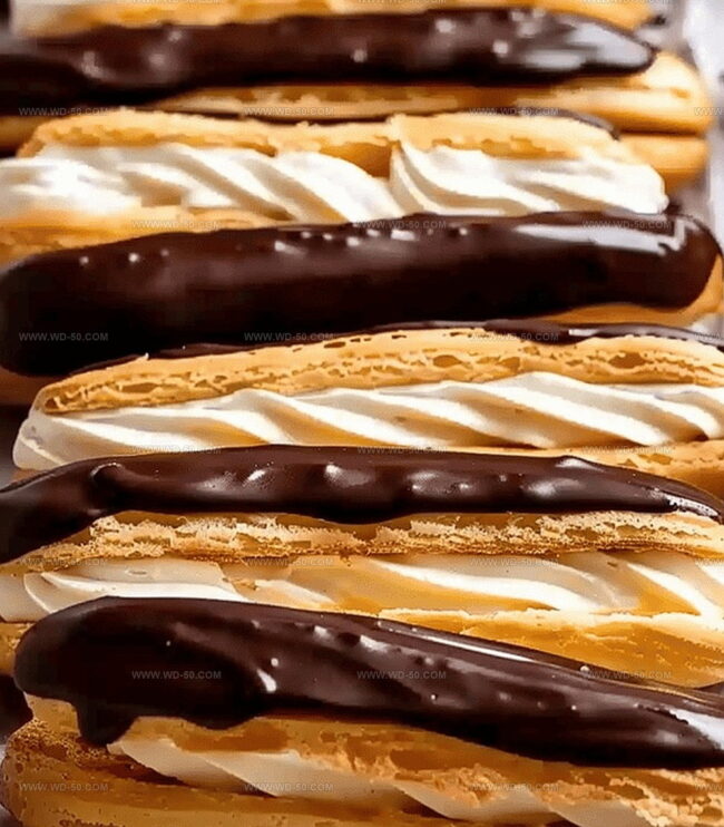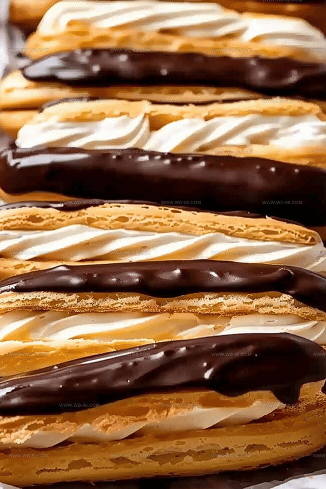 - Final Assembly: Delicately dip pastry tops into glossy chocolate glaze. Fill interiors generously with prepared cream using a piping bag. Replace pastry tops to complete the classic chocolate eclairs.
