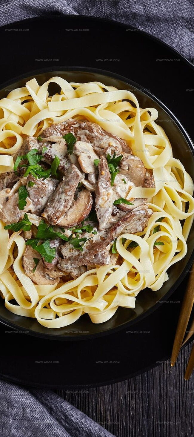 Tender strips of beef melt into a luxurious sauce that hugs each tender noodle with decadent warmth.