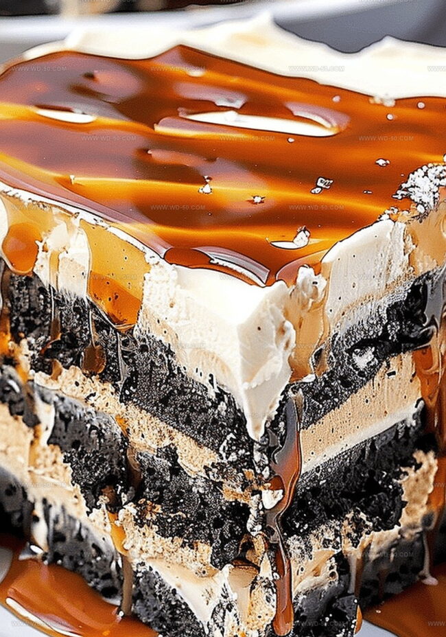 Delightful no bake salted caramel oreo icebox cake combines creamy layers with chocolate cookie crunch. Chilled dessert promises rich caramel notes and indulgent texture, delighting taste buds with each cool, sweet spoonful.