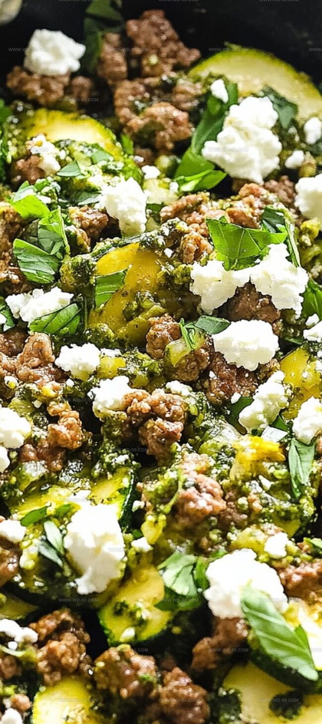 Pull the skillet from the heat and introduce a swirl of basil pesto. Scatter crumbled goat cheese and fresh parsley across the top, creating a luxurious and creamy finish that elevates the entire dish.
