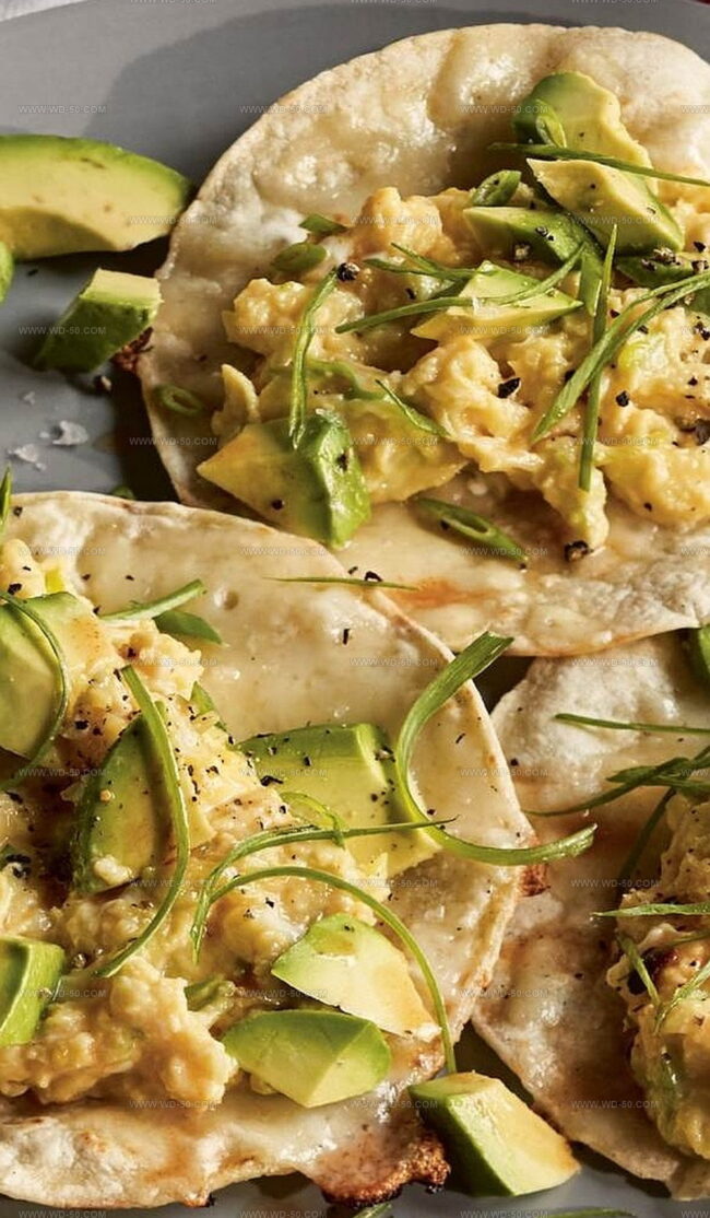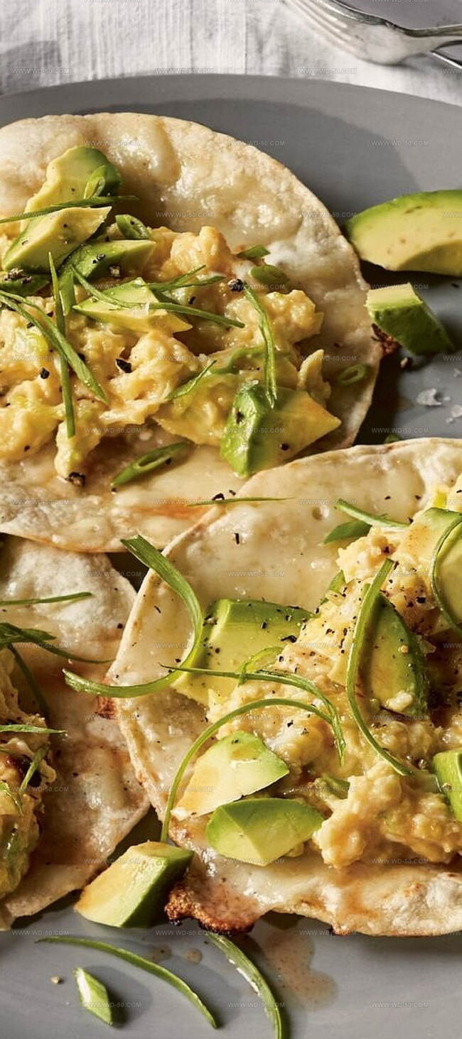Warm tortillas cradle delicate scrambled eggs while creamy avocado adds luxurious texture.