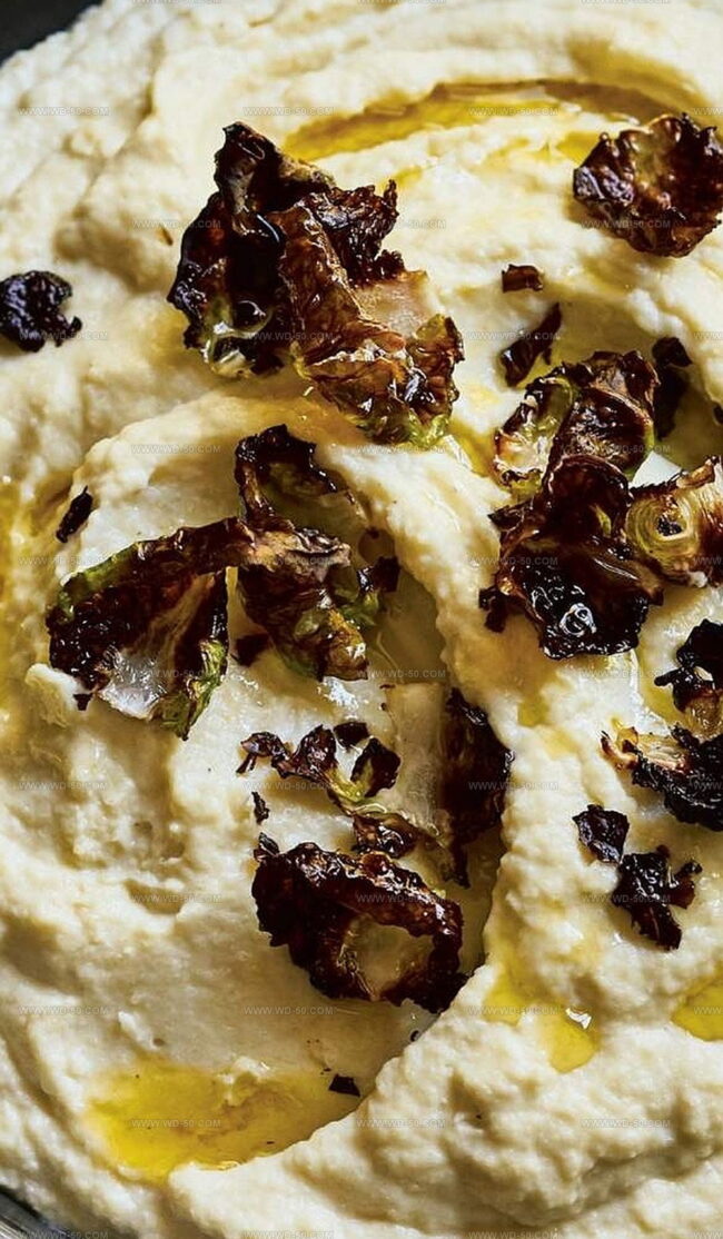 - Present the creamy purée in an elegant serving dish, embellishing with a delicate olive oil drizzle and crowning with the crisp, roasted Brussels sprouts leaves. Serve immediately while temperature and texture remain optimal.