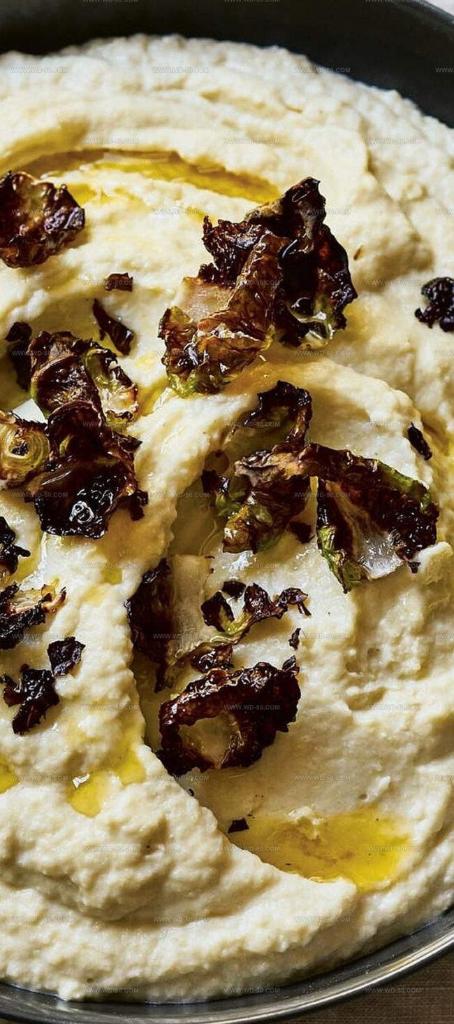 Transfer puree to serving dish. Drizzle with olive oil. Top with crispy roasted Brussels sprout leaves. Serve immediately while warm.