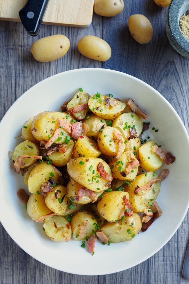 - Elegantly transfer the warm potato mixture to a serving platter. Garnish by sprinkling the remaining bacon fragments and fresh, chopped parsley across the surface before presenting to guests.
