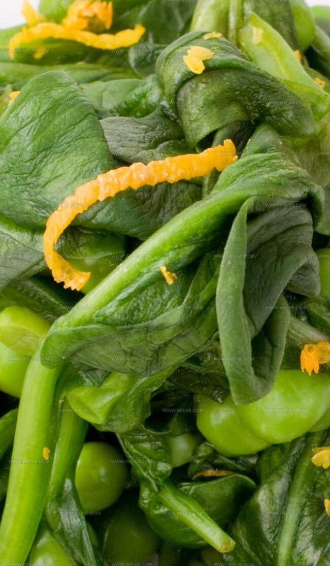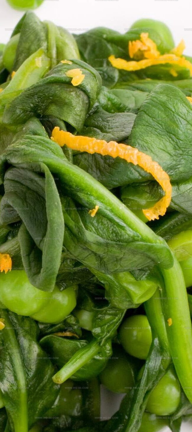- Place fresh spinach leaves in a large salad bowl. Drain cooled peas thoroughly and distribute them evenly over the spinach.