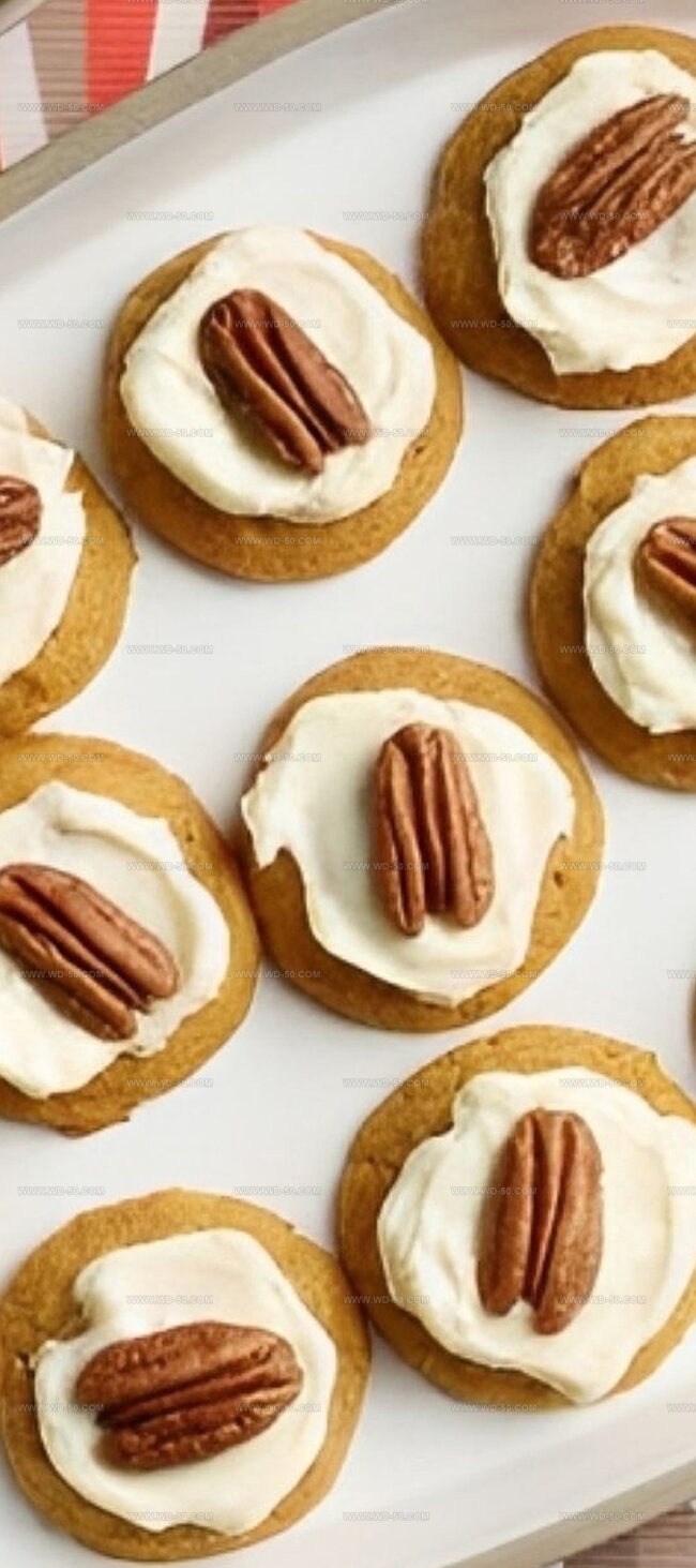 - Complete the presentation by placing a whole pecan atop each frosted cookie, adding a delightful crunch and visual appeal.