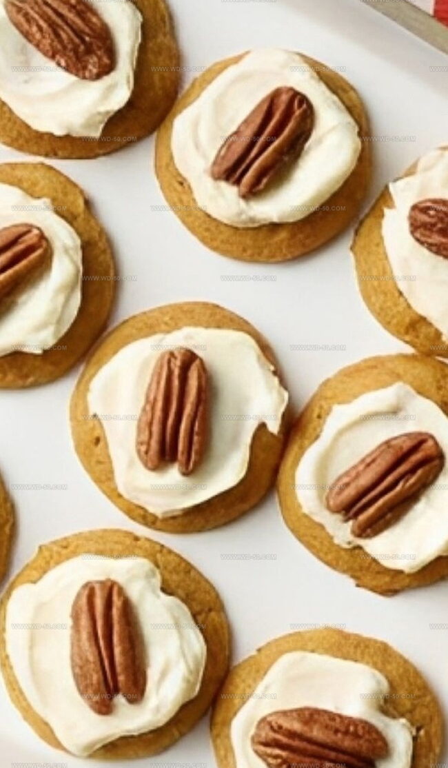 Once cookies have completely cooled, generously spread cream cheese frosting on top. Crown each cookie with a whole pecan for that extra touch of elegance.