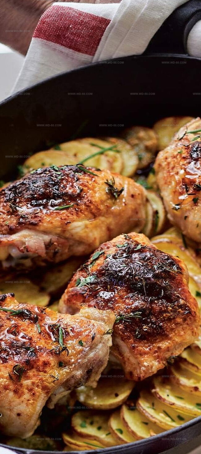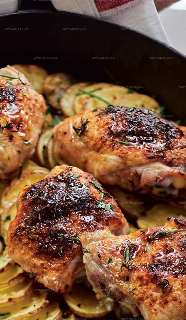 Buttermilk-marinated thighs mingle with herb-kissed potatoes in a cast-iron symphony.