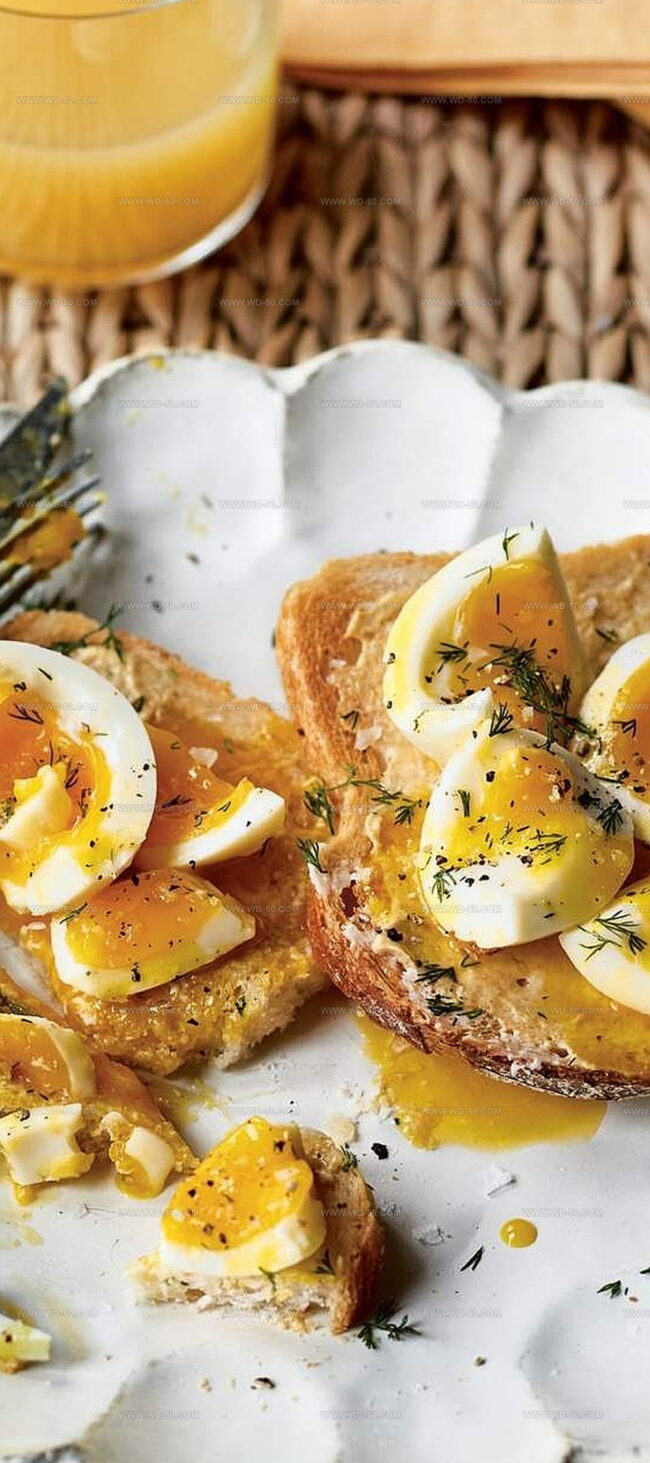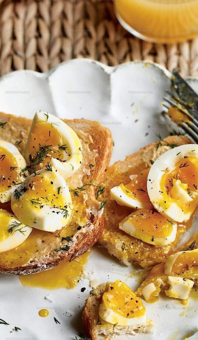 - Position one peeled egg on each prepared toast slice. Use a fork or knife to gently chop and smash the eggs, allowing the creamy yolk to seep into the bread’s surface.
