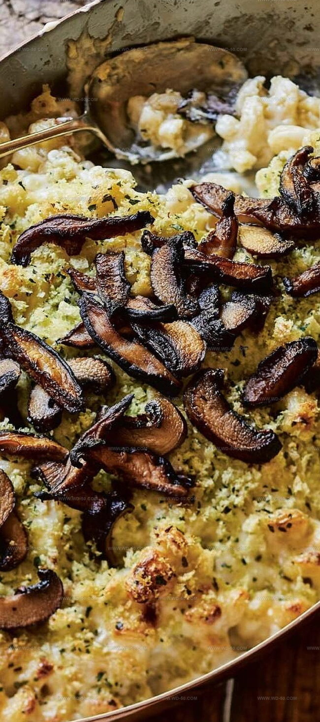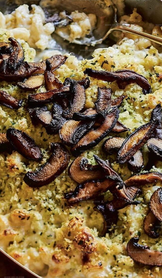 Transfer the creamy mixture to a baking dish. Sprinkle the breadcrumb mixture evenly on top. Scatter the remaining mushrooms across the surface. Slide into the preheated oven and bake for 35-45 minutes until the top is gloriously golden and the edges are bubbling with cheesy goodness. Let it rest for 5 minutes before serving up this ultimate comfort food.