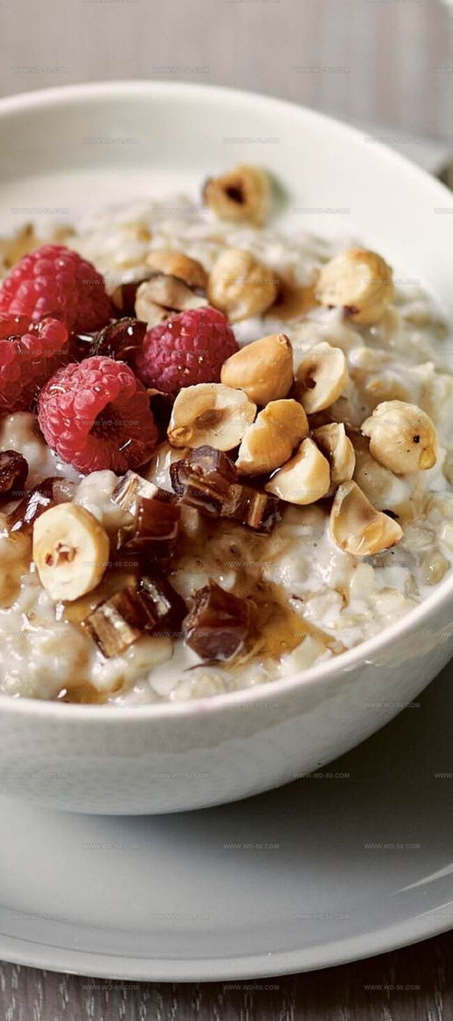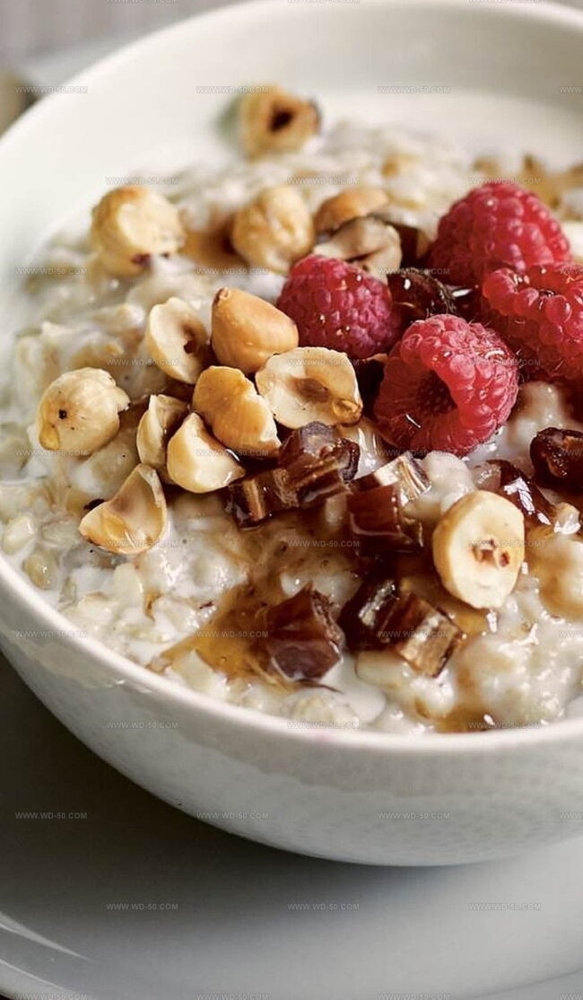 - Elegantly garnish each bowl with ½ cup (75 grams) chopped dates, fresh raspberries, and ⅓ cup (50 grams) toasted hazelnuts for added crunch and flavor.