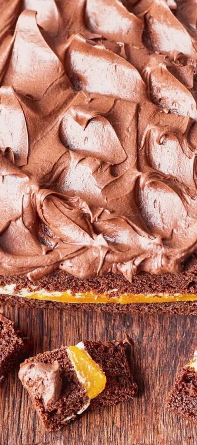 Cut the cooled cake into 2 flat rectangles. Spread buttercream on the first layer. Arrange mandarin segments across the surface. Place the second cake layer on top. Trim edges if desired. Cover the top with remaining buttercream and dust lightly with cocoa powder for a elegant finish.