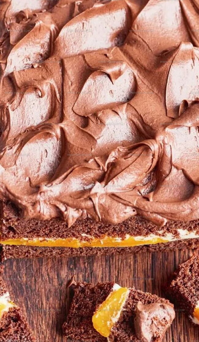 - Once the cake has completely cooled, slice it into two equal rectangular layers. Spread one-third of the buttercream evenly across the first layer, then delicately arrange mandarin orange segments on top. Carefully position the second cake layer over the first. Optionally trim the edges for a neater appearance. Finish by decorating the top with remaining buttercream and a light dusting of cocoa powder.