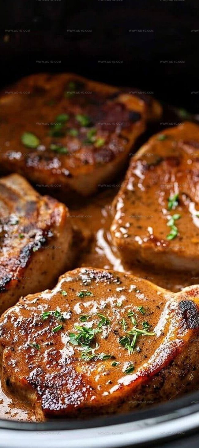 Succulent pork chops simmering in a simple slow cooker recipe have never been easier to prepare.