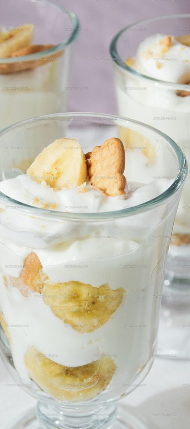 Nostalgic flavors dance through this classic dessert, blending rich pudding textures with crisp vanilla wafer crumbles.