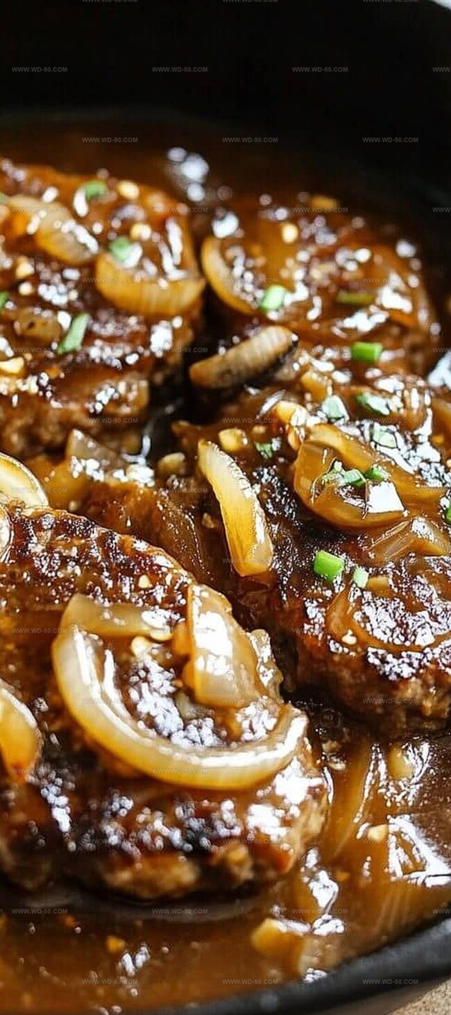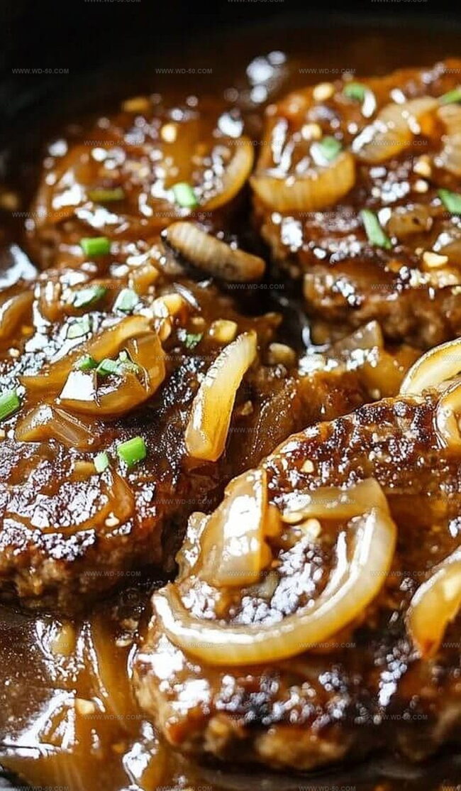 Serving: Lavishly spoon onion-mushroom gravy over the hamburger steaks, ensuring complete coverage, and present alongside creamy mashed potatoes, garnishing with fresh chopped parsley for a vibrant finish.
