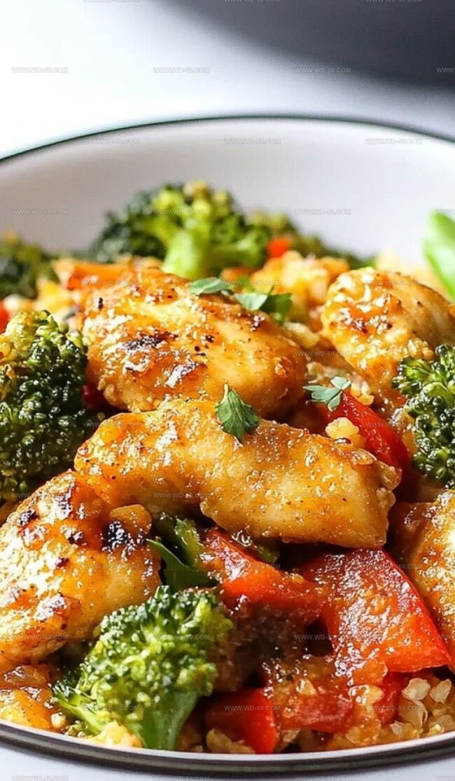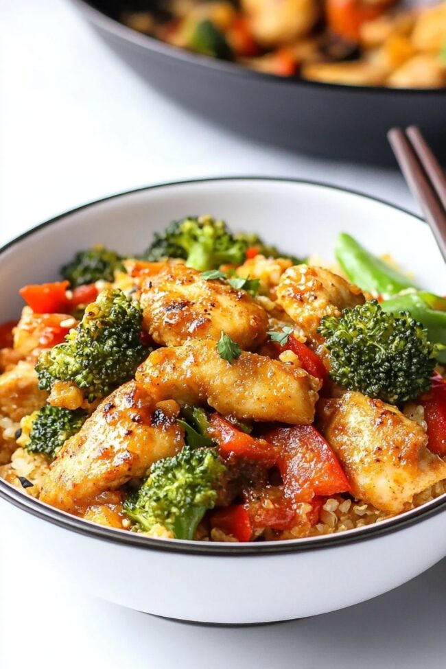 Tender chicken pieces dance with crisp vegetables in a sizzling sauce that promises zero compromise on taste.
