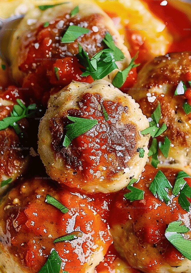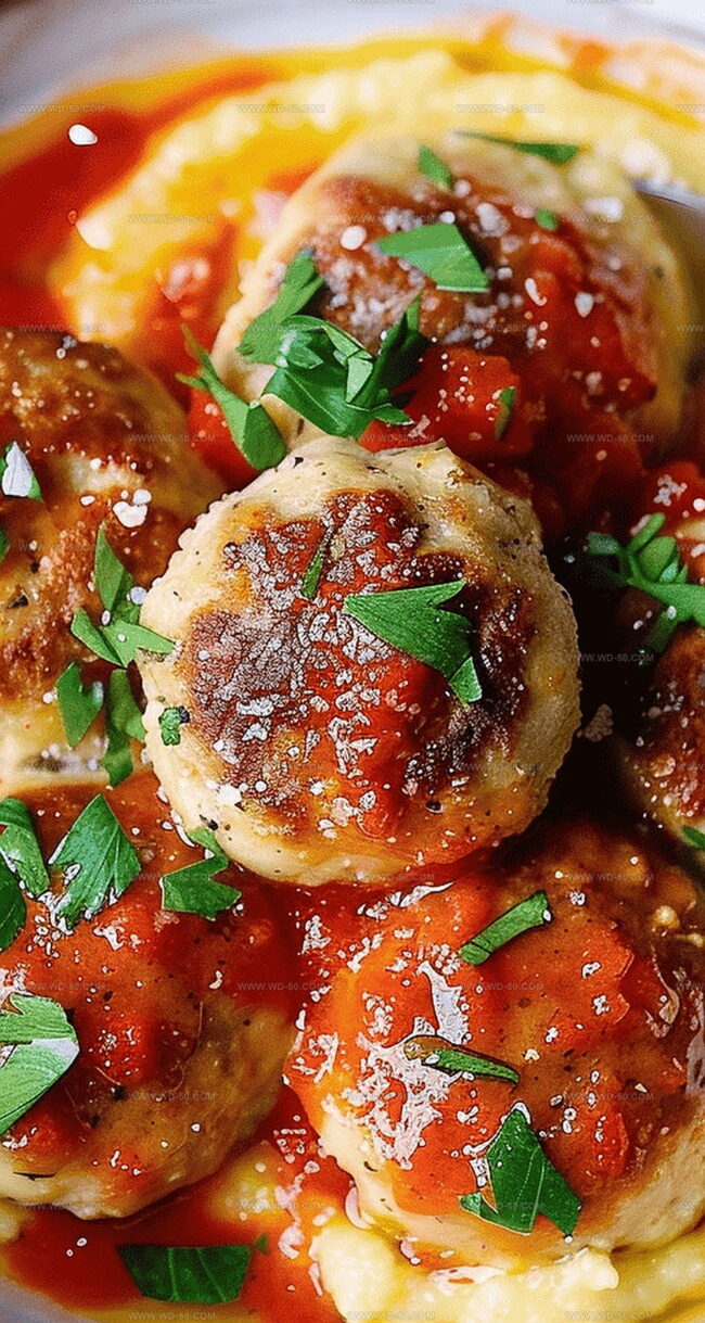 - Finishing Touches: Finely chop fresh parsley, plate creamy polenta base with saucy meatballs nestled on top, generously garnish with parsley and season to taste.