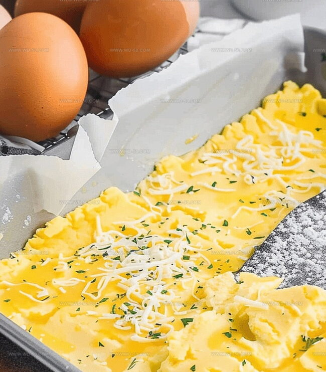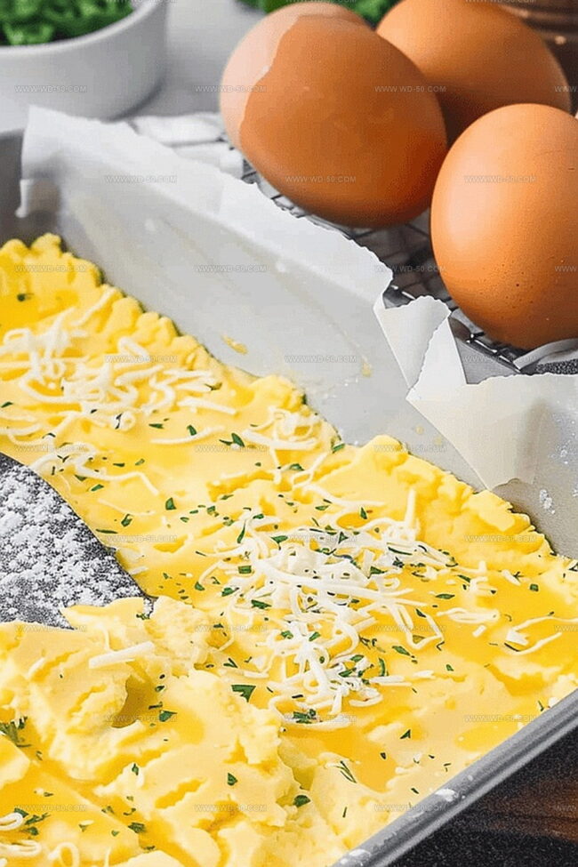 Layering: Gently pour the egg mixture onto the prepared sheet pan, using a spatula to create an even, thin layer across the entire surface. Strategically distribute shredded cheese and freshly chopped herbs, allowing them to settle naturally on top.
