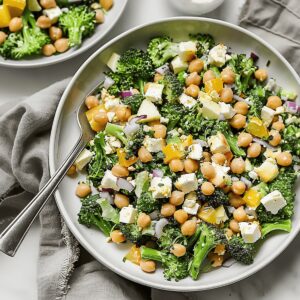 Broccoli and chickpea crunch salad delivers a Mediterranean-inspired blend of crisp vegetables and protein-packed legumes. Zesty lemon dressing and crunchy seeds create a refreshing dish you’ll crave for lunch or as a satisfying side.