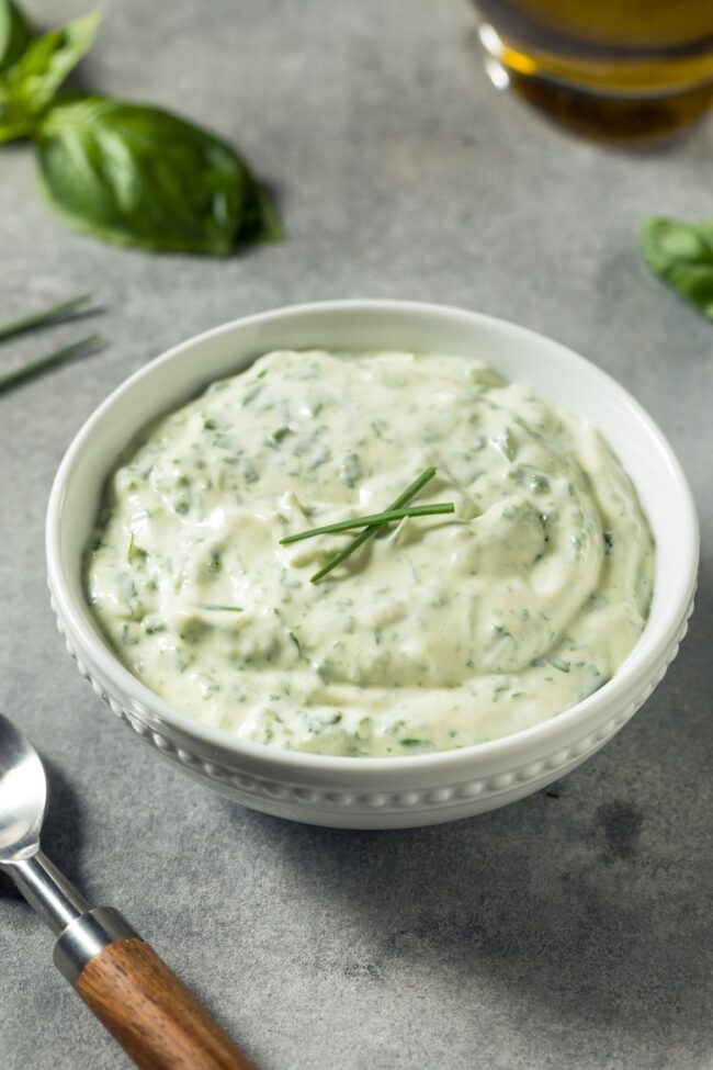 Fresh basil leaves blend seamlessly into a classic mayonnaise, creating a vibrant condiment that sings with summer flavors.